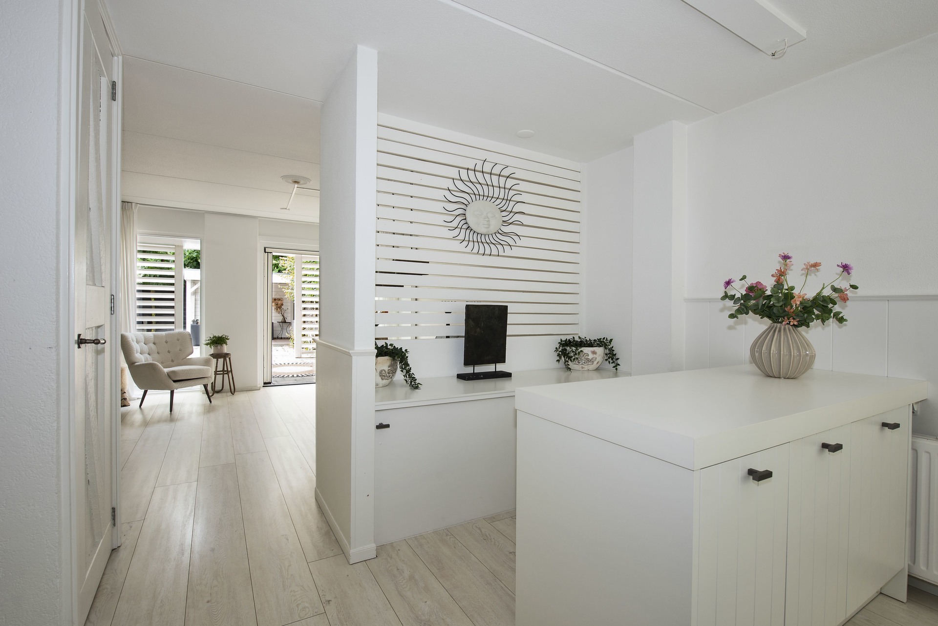 De begane grond is afgewerkt in een frisse witte kleur, wat zorgt voor