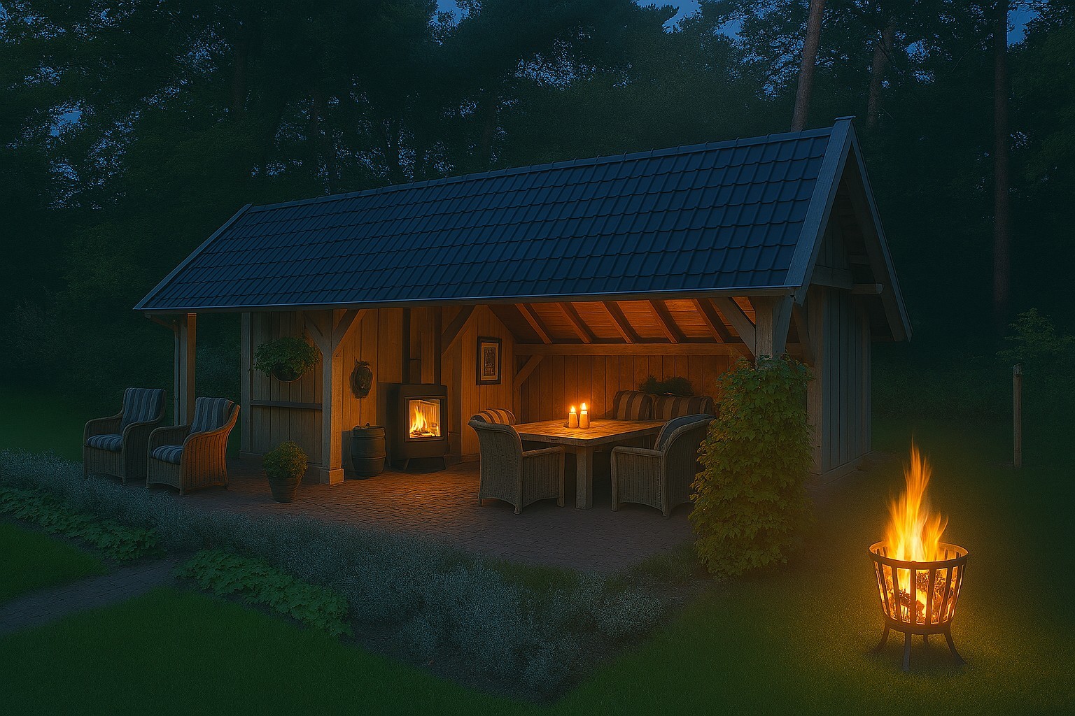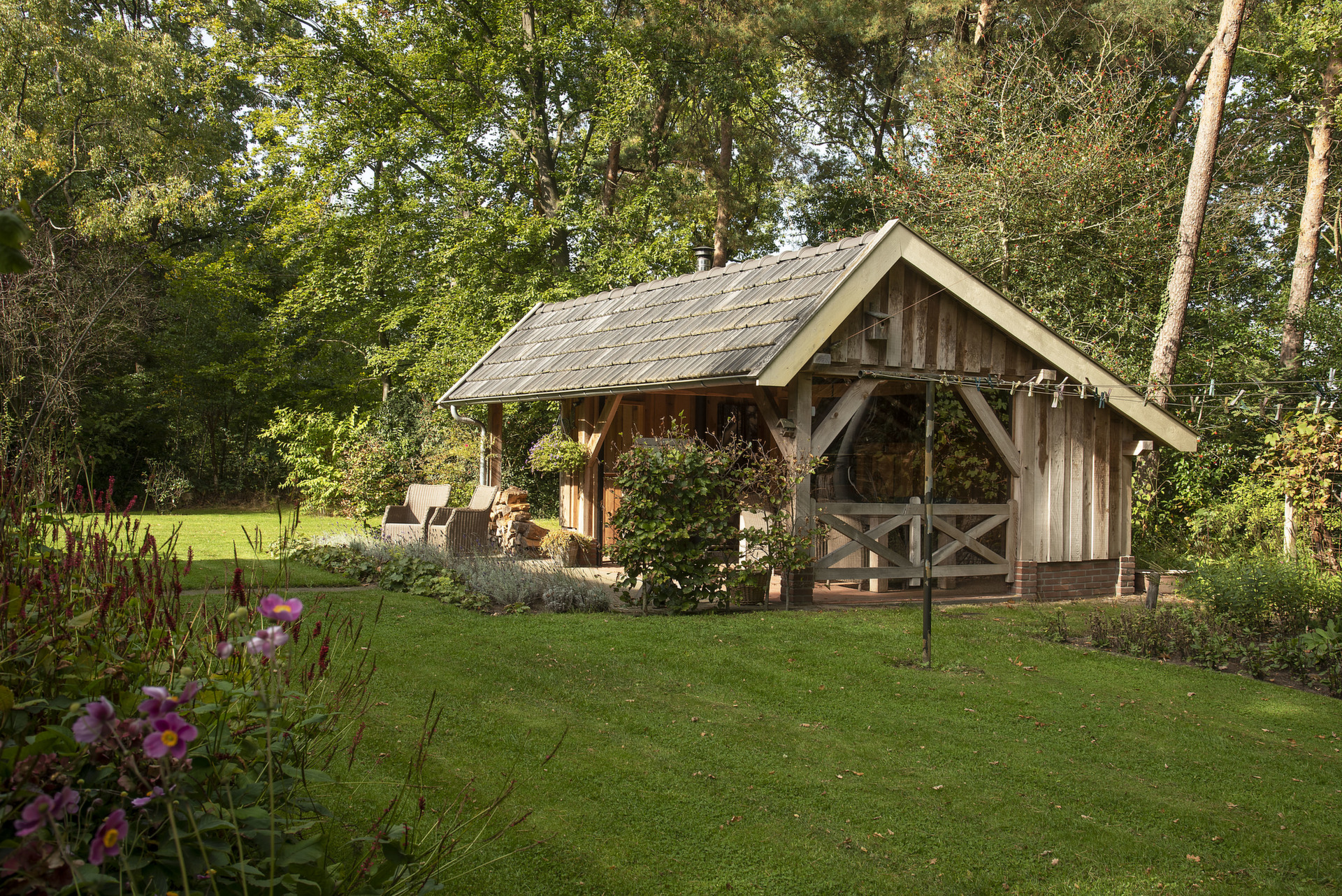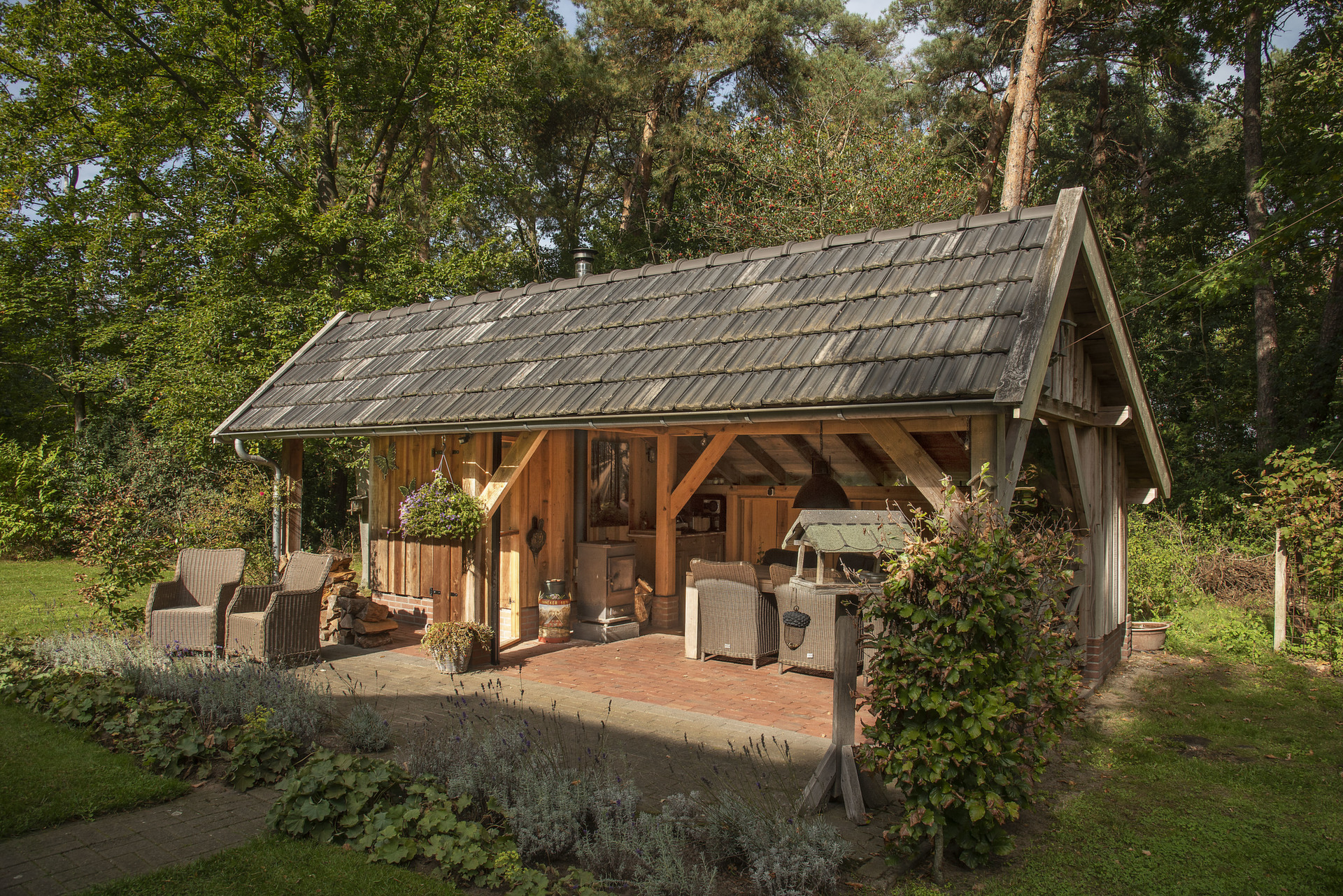 4. Fraaie overkapping met houtkachel en separate berging.
