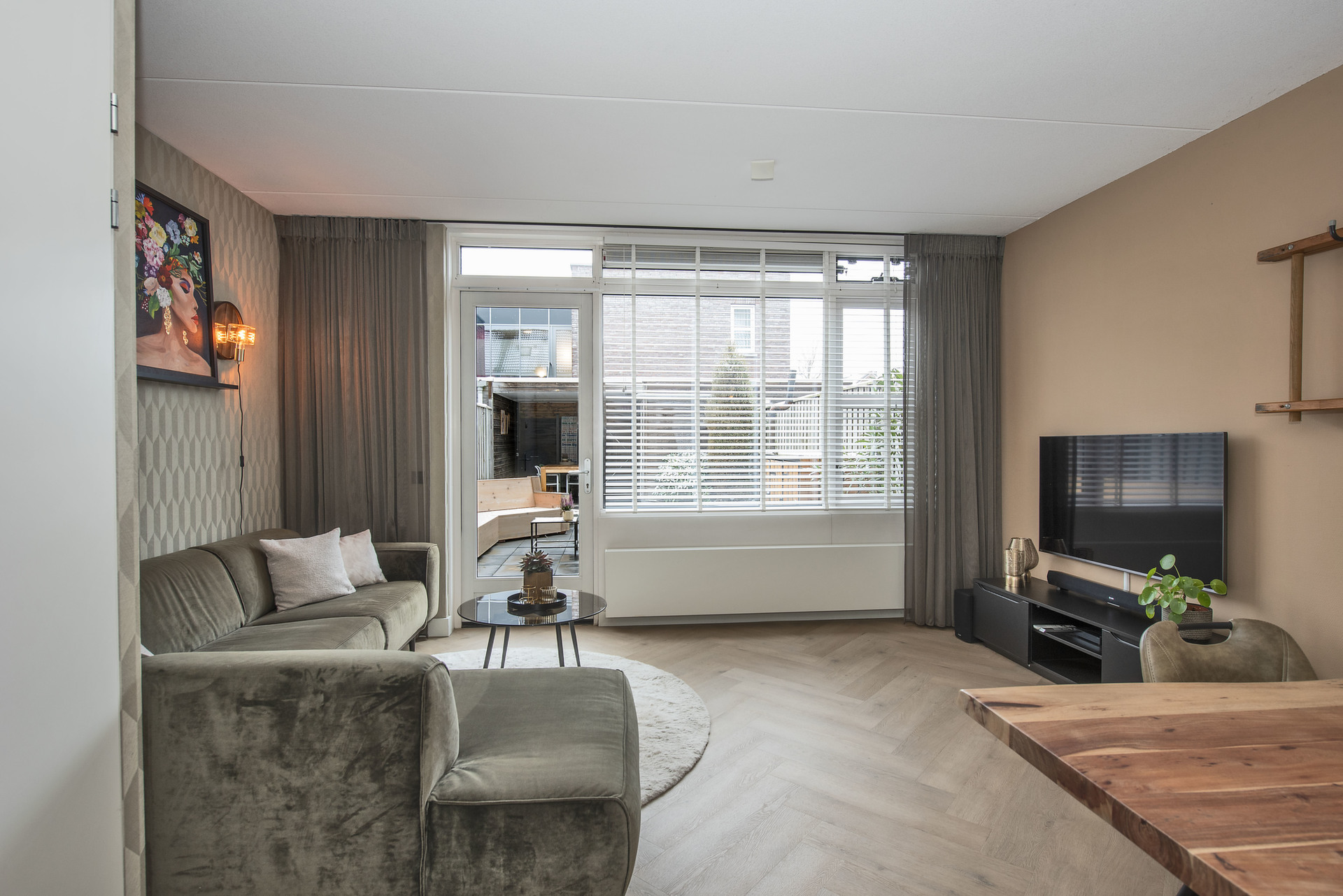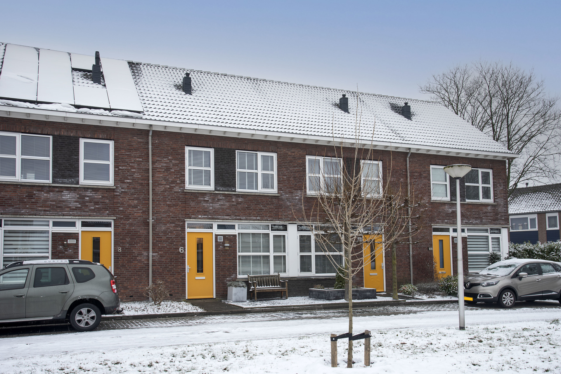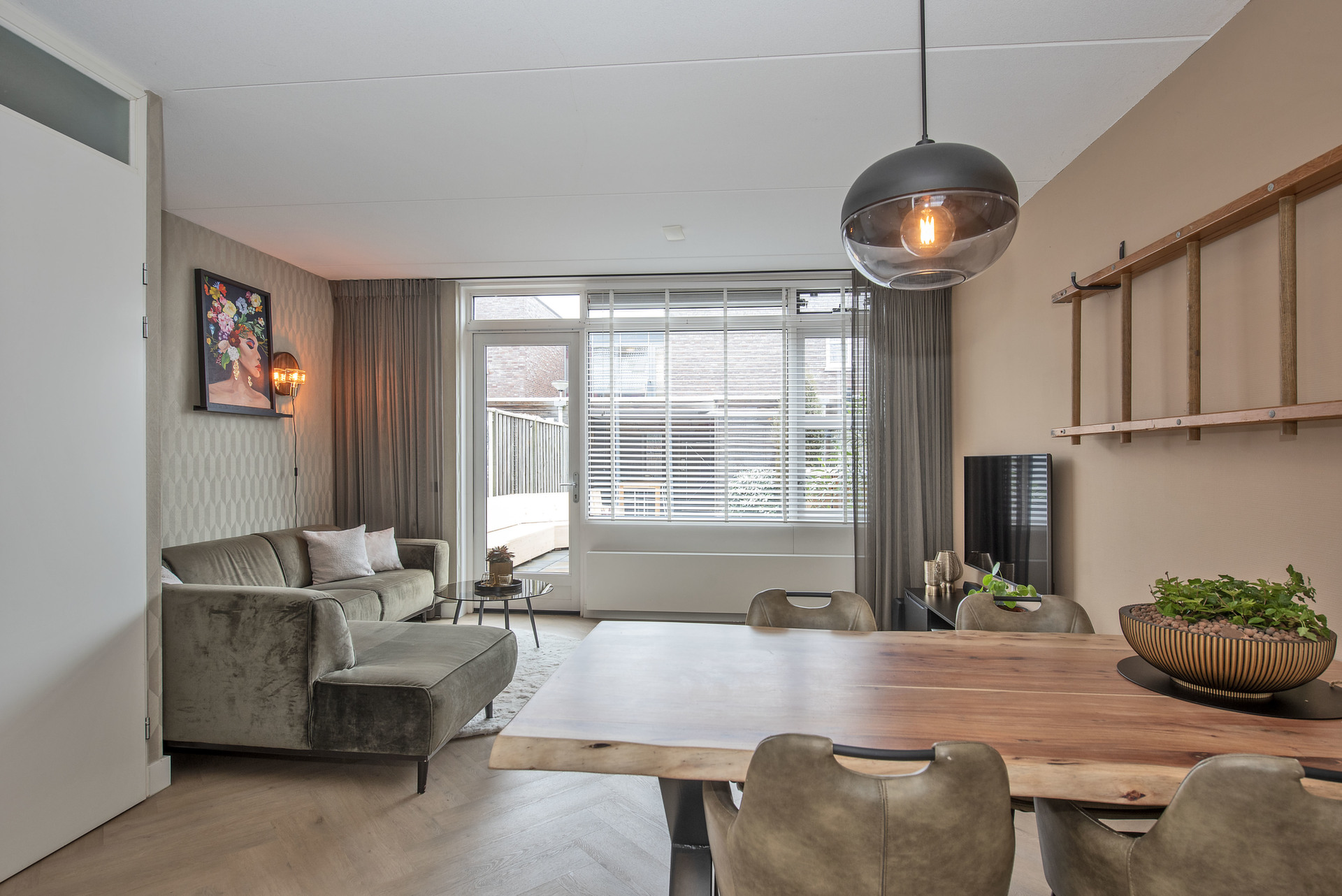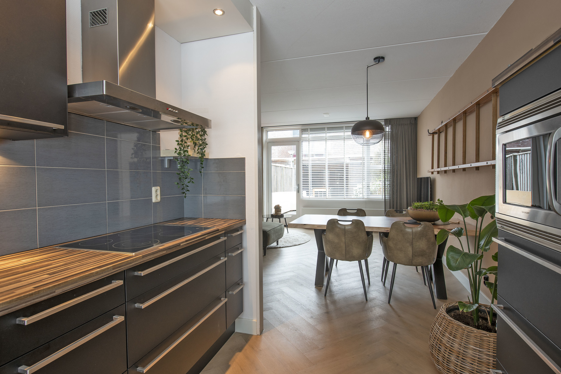 Moderne tussenwoning met uitzicht op plantsoen.
