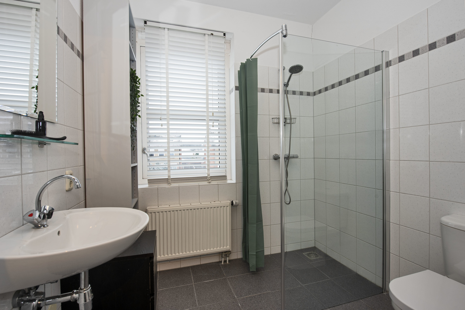 - Badkamer (± 5 m²) met douche, wastafel en toilet;