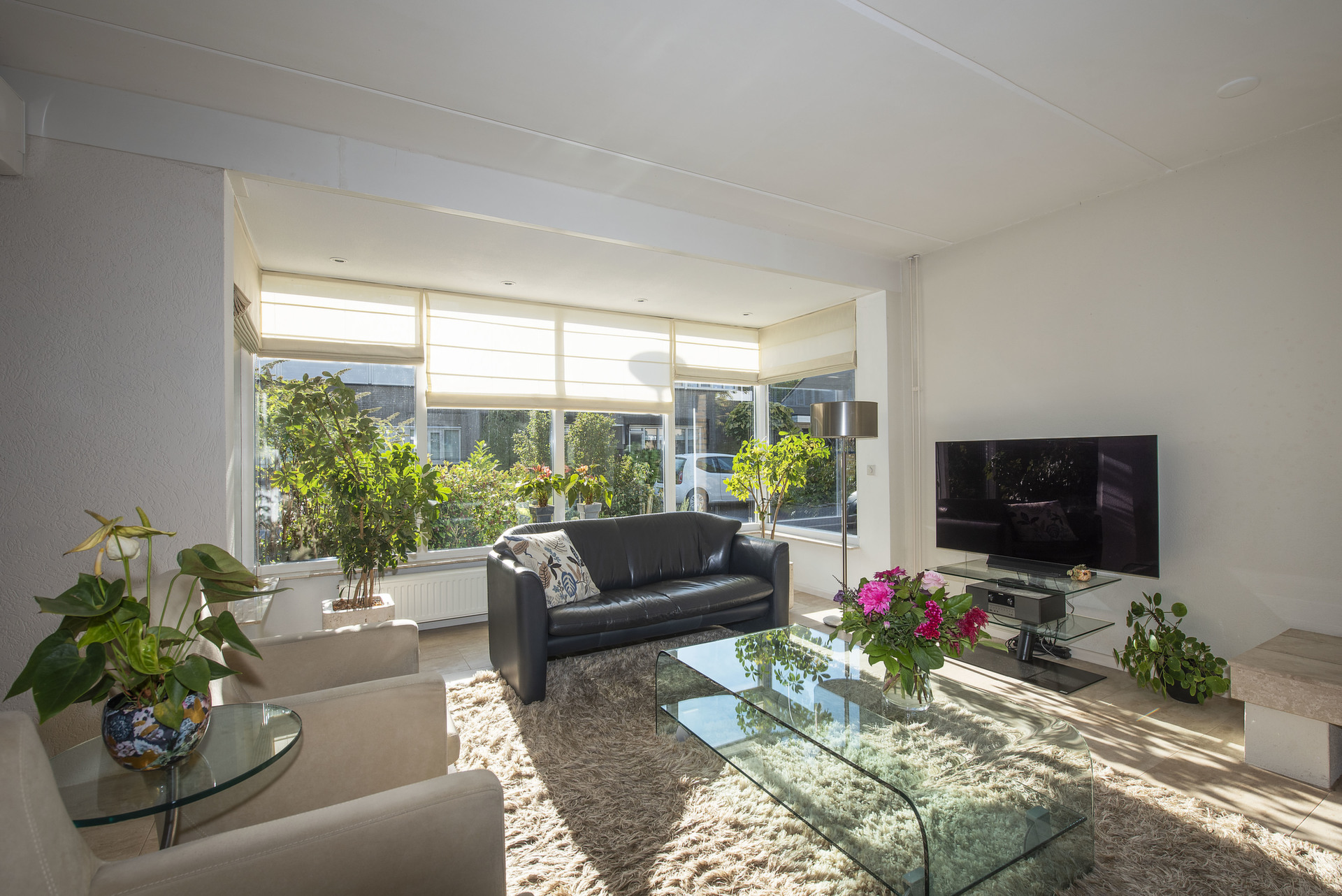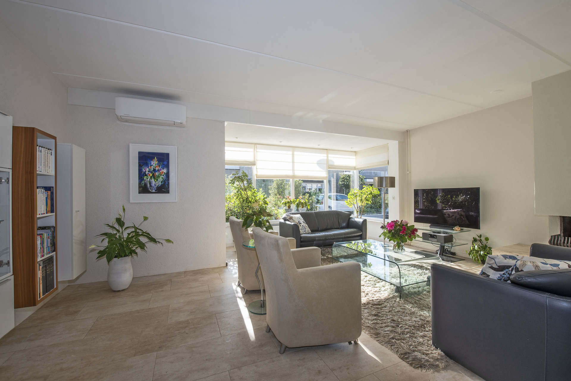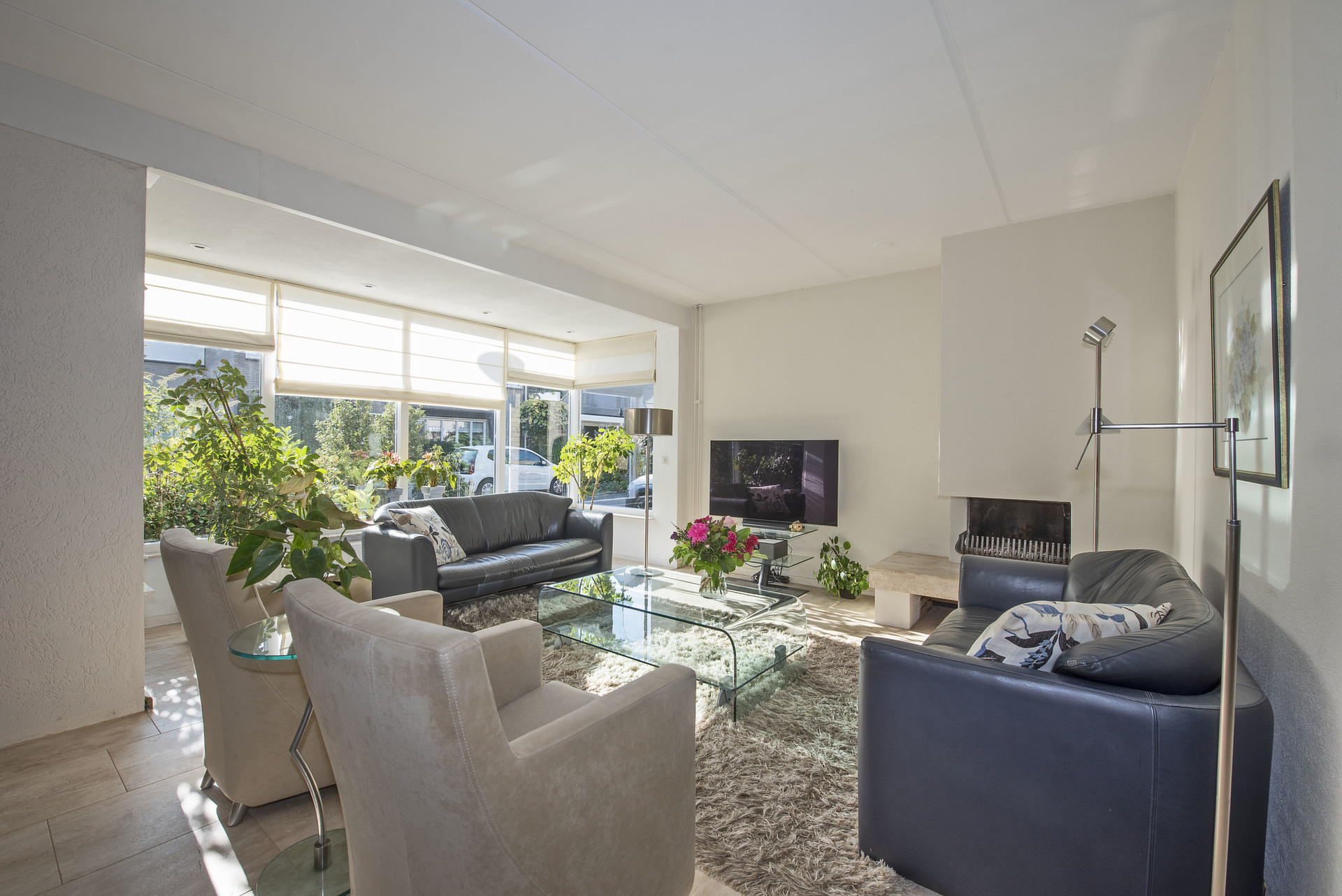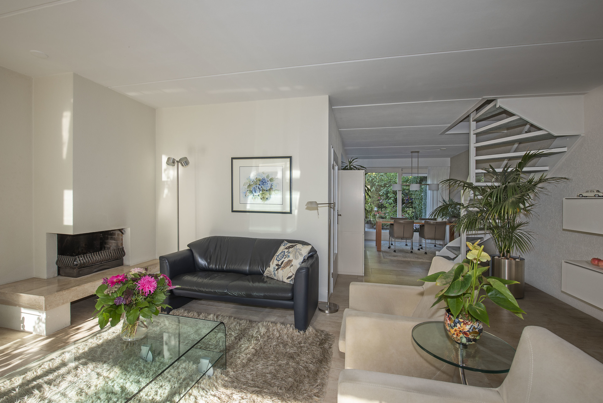 - Royale, straatgerichte woonkamer met erker, open haard en open trap naar