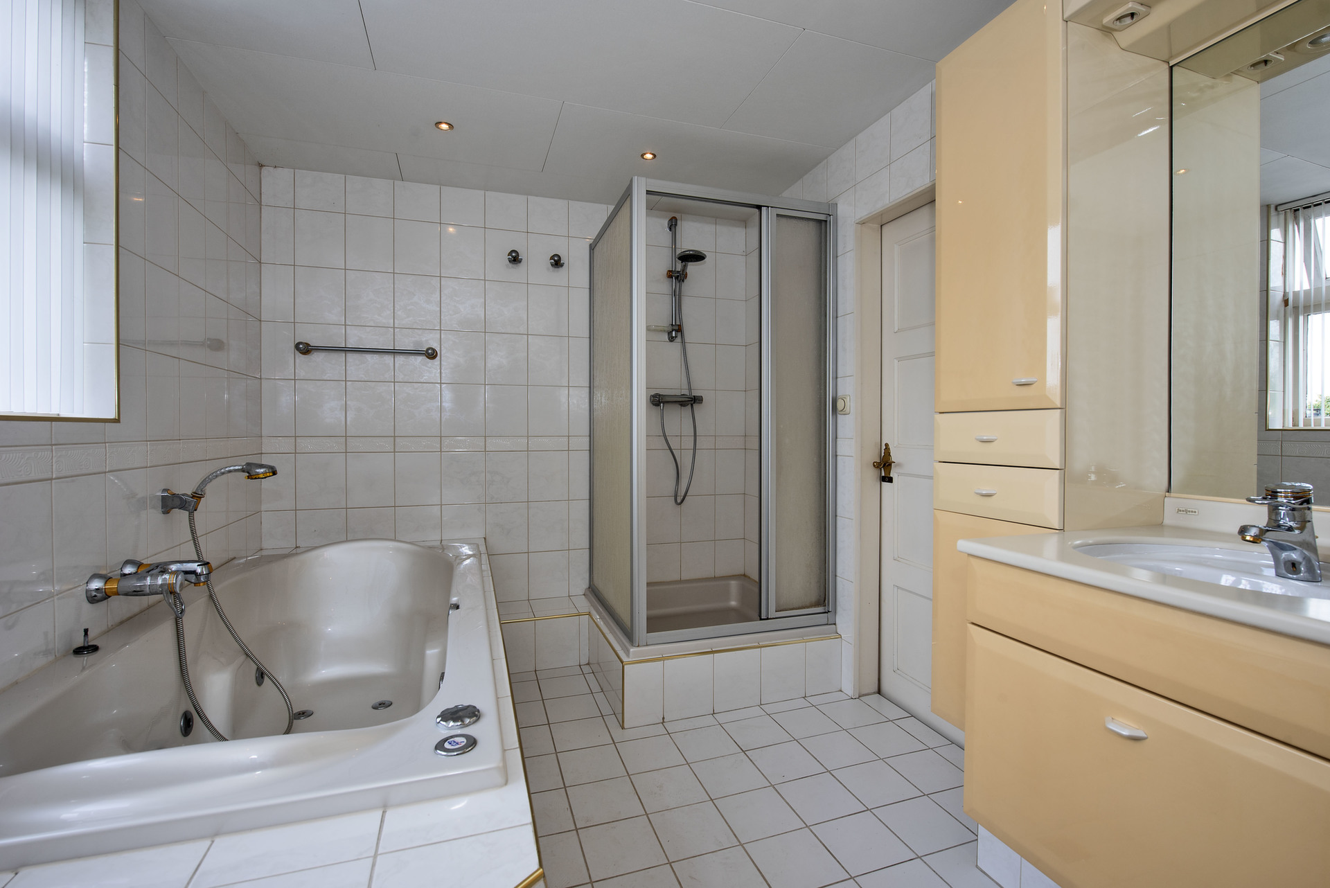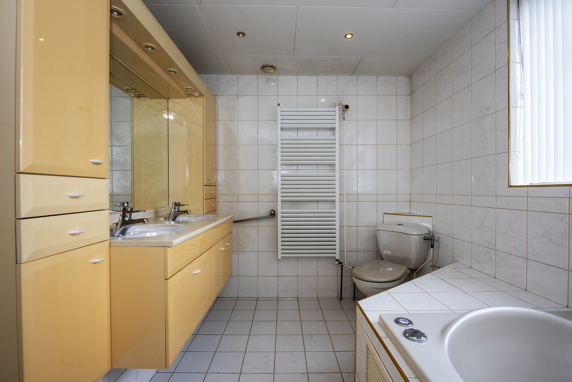 - Badkamer (± 12 m²) v.v. ligbad, douchekabine, toilet en dubbele wastafel.